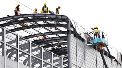 图为工人们正在紧锣密鼓地进行隔音板安装。