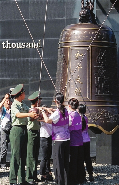 9月18日,社会各界代表在侵华日军南京大屠杀遇难同胞纪念馆撞响和平大钟,以此铭记历史、祈愿和平。新华社发