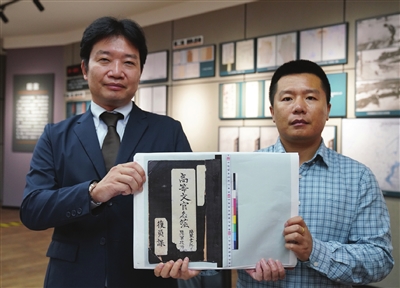 在侵华日军第七三一部队罪证陈列馆新闻中心,日本学者、黑龙江外国语学院特聘教授松野诚也(左)与哈尔滨市侵华日军细菌与毒气战史研究会副秘书长金士成展示《陆军高等文官名簿 陆军书记官 陆军技师》影印件。
