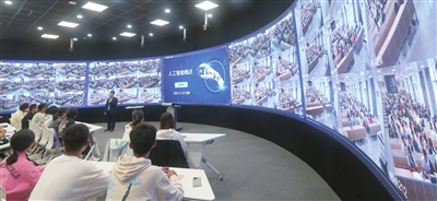 胡清华教授在全景教学空间为4000余名学生上课。 本报记者 姜宝成 摄