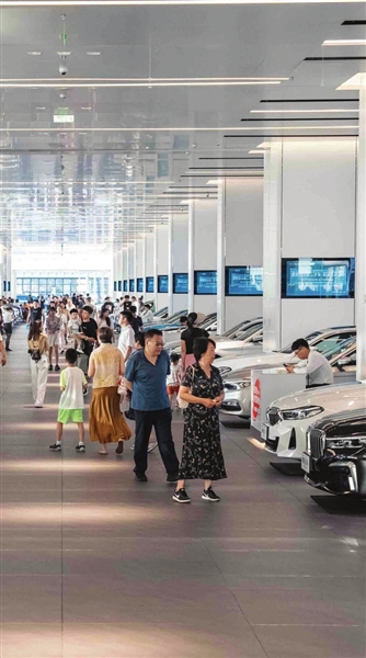 李先生口中的气派,指的正是他和记者所在的这幢手掌造型的建筑。它的占地面积约116亩、总建筑面积达12万平方米,4层立体展厅可容纳4000辆车。展出车型主要以中高端及豪华品牌为主,包括保时捷、奔驰、宝马、玛莎拉蒂、奥迪、路虎等各类知名高端品牌,以及特斯拉、理想、问界、蔚来等新能源品牌。