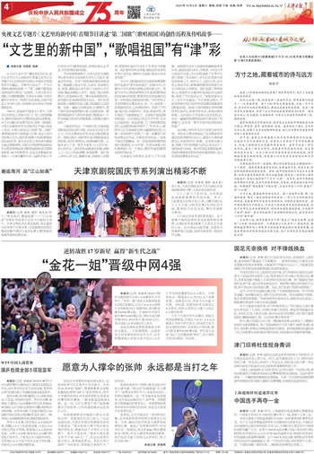 10月3日,由中央广播电视总台出品,总台文艺节目中心创制的年度重点系列文艺专题片《文艺里的新中国》在央视综艺频道等多平台播出。首期节目讲述了一个与天津颇有渊源的故事——“第二国歌”《歌唱祖国》的创作历程及广泛流传。天津人民艺术剧院、天津歌舞剧院、天津音乐学院、天津市耀华中学参与了本期节目的录制,在新中国成立75周年之际,用戏剧与音乐将这个故事娓娓道来。