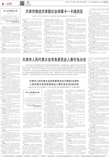 《天津市人民代表大会常务委员会关于修改〈天津市人民代表大会常务委员会人事任免办法〉的决定》已由天津市第十八届人民代表大会常务委员会第十二次会议于2024年9月27日通过,现予公布,自公布之日起施行。