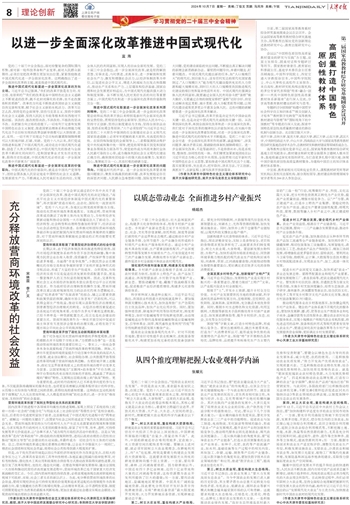 习近平总书记强调,改革开放是决定当代中国命运的关键一招,也是决定中国式现代化成败的关键一招。从改革到深化改革,再到全面深化改革和进一步全面深化改革,我们党对于深化改革的规律性认识愈加深刻,在实践中推动进一步全面深化改革愈加彻底,对进一步全面深化改革、推进中国式现代化的领导水平不断提高。党的二十届三中全会对进一步全面深化改革所作的部署,涵盖领域广、涉及问题多、解决矛盾尖锐、要破除的体制机制障碍艰巨。进一步全面深化改革,不是零敲碎打,不是修修补补,而是系统性、整体性、协同性的统一体。我们要更加紧密地团结在以习近平同志为核心的党中央周围,全面贯彻习近平新时代中国特色社会主义思想,紧扣推进中国式现代化这个主题,落实部署安排,突出重点,把牢取向,讲求方法,守正创新,真抓实干,在新征程上谱写改革开放新篇章。