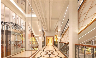 例如,在老厦外檐复原过程中,将通过修补、清洗等方式,全面复原外檐水刷石外墙历史面貌;拆除老厦上层凹型阳台后期添加的装饰,恢复外立面门窗的棕色油饰;拆除首层上世纪80年代外挂深色大理石材饰面,复原首层历史挑檐造型和颜色,与老厦上部外檐协调统一;提升首层橱窗的场景展示功能,增强沿街的商业氛围和互动效果。