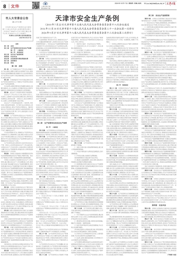 《天津市安全生产条例》已由天津市第十八届人民代表大会常务委员会第十二次会议于2024年9月27日修订通过,现予公布,自2024年11月1日起施行。