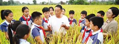 10月16日是世界粮食日,各地开展主题教育活动,增强孩子们爱惜粮食、节约粮食的意识。图为浙江省武义县三角店小学学生在壶山街道三角店村稻田里听农民讲水稻种植过程。 新华社发