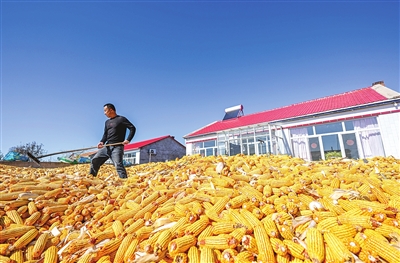 内蒙古通辽市地处“黄金玉米带”,今年玉米种植面积达1900余万亩。图为在通辽市开鲁县小街基镇明升村,村民晾晒玉米。 新华社发