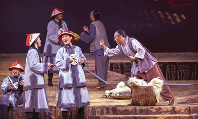 到底安文忠他们参加过多少个战役,历史上也没有记载。赶大营就是跟着军营走,军营到哪里安营扎寨,他们就在哪里做生意,为士兵们提供后勤保障。“戏里必须要有场景,但书上记载就这么简略一段。到底做什么买卖、怎么做的,都没有记载。作为戏剧搬上舞台,就要编了。为了故事的发展,我们就专门编了一组跟西征军战士之间的戏。跟着军营赶大营,赶的是这些军队,就得跟军队有关系,舞台上就要呈现出人物关系和故事。所以我们在这里设计了许三贵这样一个人物。”钟海介绍。