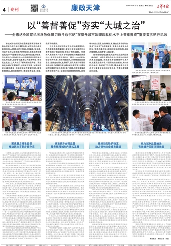 习近平总书记关于城市治理的重要要求,为天津推进高质量发展、建设社会主义现代化大都市指明了前进方向,提供了根本遵循。市委深入贯彻落实习近平总书记视察天津重要讲话精神,全面贯彻落实党的二十届三中全会精神,领会精神实质,把握实践要求,从保障居民安居乐业、坚持走内涵式发展路子、强化党建引领基层治理创新、加强韧性安全城市建设等方面,对提升城市治理现代化水平作出专门部署,不断完善推进城市治理现代化、促进安全发展体制机制,深化城市建设、运营、治理体制改革,健全筑牢首都政治、安全“护城河”的保障体系,完善公共安全治理机制,完善共建共治共享的社会治理格局,强化大城细管、大城智管、大城众管。