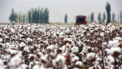 金秋十月,新疆阿克苏地区阿瓦提县的长绒棉进入采摘季,大型采棉机来回穿梭,雪白的棉花被快速采摘、打包、装车,现场一派繁忙的景象。这是10月24日在新疆阿瓦提县拍摄的棉田。 新华社发