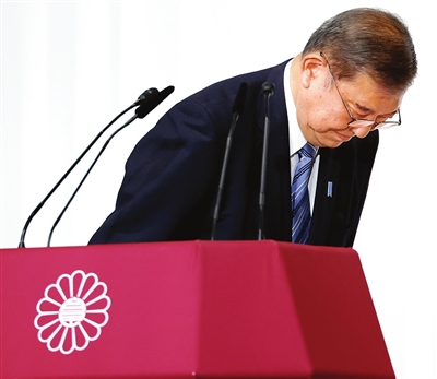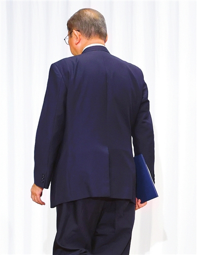 石破茂结束在记者会上的讲话后向台上议员鞠躬。 新华社发
