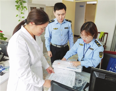 宁河区市场监管局组织开展医疗器械质量抽查检验工作,执法人员依法检查被抽样单位的产品注册证、合格证明等文件。