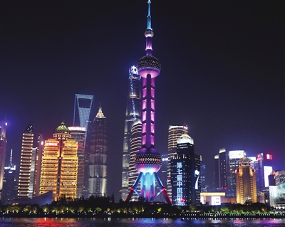 位于上海陆家嘴的东方明珠广播电视塔亮起主题灯光。