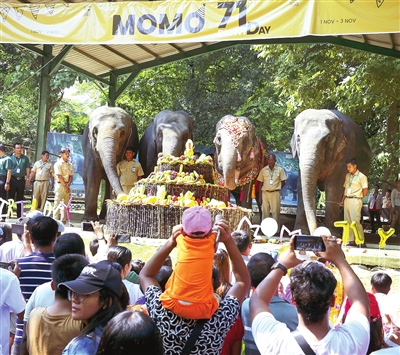 11月3日,缅甸仰光动物园举办活动为雌性大象“莫莫”庆祝71岁生日。 新华社发