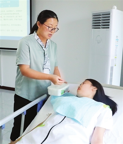 天津职业大学老师为失能老人家庭照护者分组培训实操模拟照护。
