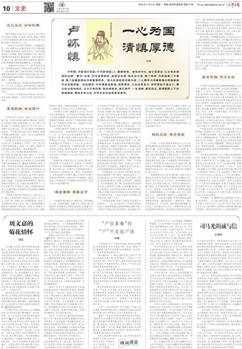卢怀慎在去世两年之后,仍能让皇帝感动得流泪,的确不是一般官员所能比拟的。令人钦佩的是,卢怀慎不仅自己为官清廉,而且十分注重家教和纯正家风的传承,长子卢奂,刚直果毅、两袖清风,历任御史中丞、陕州刺史、广州太守。每至一地,都留下不少善政,玄宗皇帝赞许他:“斯为国宝,不坠家风。”短短八个字,由衷嘉许了他们卢家一门为官为人的巨大成功;少子卢弈,清正廉洁、担当有为,初为卢县县令,以功绩提拔为给事中,拜御史中丞,受命守卫洛阳。安史之乱爆发后,守卫官员们纷纷逃散,东都不幸陷落,被俘的卢弈宁死不屈,为国捐躯,留下千古美名;曾孙卢元辅,少以清行闻于时。进士擢第后,历杭、常、绛三州刺史,以名节著于史册,受到世世代代人们的由衷赞美。