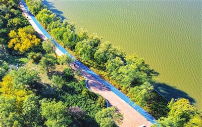日前,水上公园东湖“蓝丝带”铺装工作顺利完成。“蓝丝带”全长750米,市城市管理委采纳市民建议,在东湖玫瑰大道原有砖混路面上铺设柔性塑胶跑道。据介绍,提升改造公园便民服务设施是今年20项民心工程之一,水上公园、南翠屏公园、水西公园、天津动物园都增建了智能健身和商业便民设施。近日,这些服务设施已全部完成提升改造。图为水上公园柔性塑胶跑道。 本报记者 廖晨霞 吴迪 摄影报道