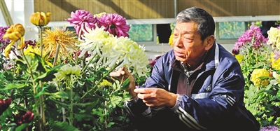 中国菊艺大师叶家良在花圃里照看菊花,他及团队培育的菊花吸引着众多观众。