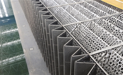 图为2023年9月18日,水下振动台水池边安装的减浪装置。