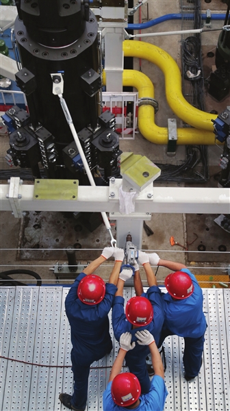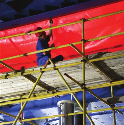 图为2023年9月29日,安装水下振动台底部防水材料。