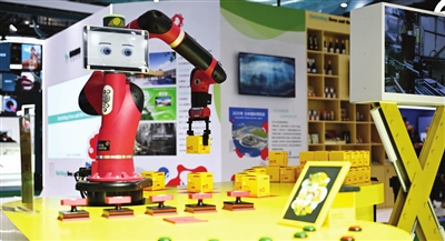 进博会服务贸易展区DHL(敦豪)展台拍摄的分拣机械臂。 新华社发