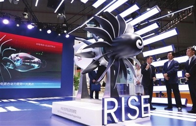 参会者在进博会技术装备展区GE(通用电气)展台的RISE技术验证项目模型旁交流。