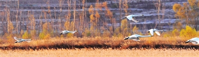 图为天鹅在河北省张家口市怀来县官厅水库国家湿地公园栖息觅食。 新华社发