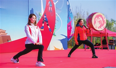 活动现场,王赐月和李妮娜当起健身教练,分别结合游泳项目和滑雪项目特点,为大家进行科学热身动作示范。在分享科学锻炼小技巧后,两位冠军带领大家一起做热身锻炼。