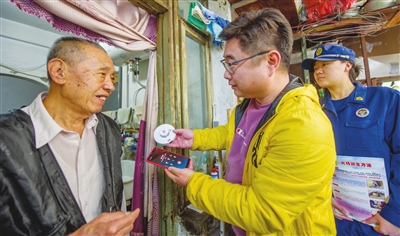 南开区消防救援支队、万兴街华章里社区为空巢老人在户内安装报警设备。