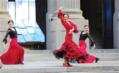 本报讯(记者 张帆 摄影 姚文生)昨天,“邂逅·天津街角系列”之最美街角《弗拉明戈》在和平区泰安道“爱墙”下浪漫绽放。明快的节拍,飞扬的裙摆,热辣的舞姿,自由随性的弗拉明戈舞蹈让市民在落叶纷飞的最美季节中,感受充满异域风情的天津。