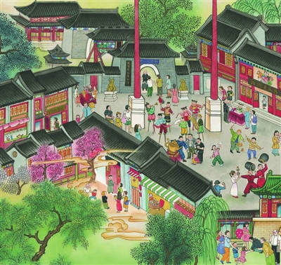 正式创作时,我们每个人负责画海河中的一段。画古文化街和天后宫时遇到了一点儿困难——天后宫离海河较远,画面中看不到,但我们觉得不能遗落,所以运用了杨柳青年画的构图方法,将重点内容集中起来,整体呈现了天后宫和古文化街。最终这一部分内容,可以说是整个长卷的一个亮点。