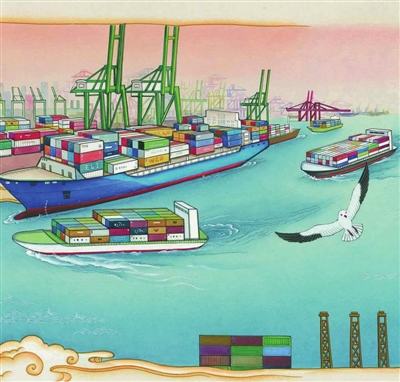 完成了第一遍构图,天津出版传媒集团的领导看过后提出建议,天津港这部分看上去有些小,体现不出世界一流港口的气势,也让整幅长卷显得虎头蛇尾。我们又对画中的天津港进行了再度创作。在最后完成的画面中,天津港,也就是海河入海口这一部分,旭日东升,海鸟飞翔,载满集装箱的货船来往穿梭,荡起层层波涛,码头上一架架起重机、一辆辆货车忙忙碌碌,一派朝气蓬勃的繁忙景象。在长卷中,天津港体现出了一种气魄,象征着天津以开放的姿态拥抱世界,大家都觉得效果不错。