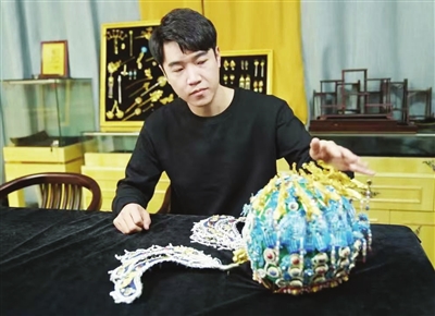 武清马氏花丝镶嵌制作技艺第四代传承人马赛,在位于崔黄口镇幌刘庄村的工作室内展示自己的凤冠作品。