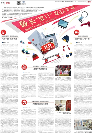 本报记者在采访中发现,因为“战线拉长”,让这个“双11”和往年相比有点“不一样”。比如,消费者更从容地看待电商促销,购物时更加理性。声嘶力竭的带货主播“超低价”,也变得不再那么“香”。再比如,尽管快递数量很多,但拉长的战线让快递从业者压力减轻。此外,今年受益于以旧换新政策补贴,不少线下商场在“双11”期间也收获颇丰,既“抢”来了“流量”,也获得了业绩“增量”。