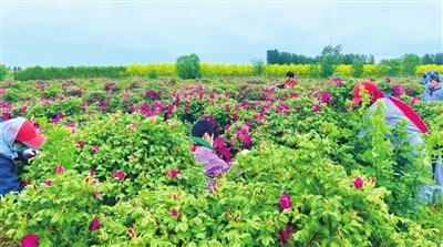 西刘举人庄村花农们穿梭在芬芳的玫瑰园中采摘花冠