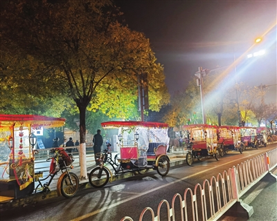 红顶子、塑料布、两排座位、电动马达……10月29日和11月10日19时左右,记者两次来到“天津之眼”红桥区一侧海河边,看到这里聚集了20多辆款式基本统一的观光电动三轮车,车主或坐在车上,或站在车旁,对着过往的行人招揽生意,“坐三轮车转转吗?”“30元一位,包车4人100块。”“沿着海河转一圈,还能去意式风情区。”“转悠半个多小时,划算。”