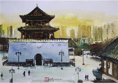 鼓楼位于天津老城厢中心,始建于明朝弘治年间,历经多次重建和修缮,是天津城市历史的重要见证者。鼓楼高三层,一层方台下宽上窄,辟有四个拱形门洞,通行东西南北四条大街。方台上建有汉白玉栏杆,木楼设斗拱和飞檐,做殿式旋子彩画,重檐歇山屋顶。我的这幅水彩画着重表现朝霞中的建筑光影之美,通过对光影的运用及虚化的远景高层群,形成画面对比节奏关系,突显鼓楼建筑主体,也营造出历史记忆和文化传承的独特意境,体现天津这座城市的底蕴与魅力。