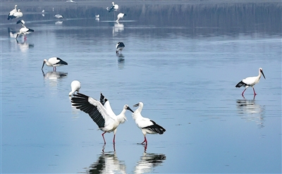 周末这两天,第二批东方白鹳抵达,与已经落脚的鸟儿们一起享受着静谧的美好时光。它们时而在空中盘旋、时而追逐嬉戏、时而觅食休憩,形成一幅生态自然的美丽图景。护鸟志愿者监测发现,这批东方白鹳有1000余只。根据往年候鸟迁徙情况,本月还将有以东方白鹳为主力军的候鸟前来栖息。