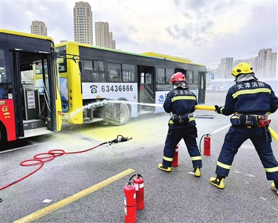 本报讯(记者 万红 摄影 张磊)昨天,2024年天津市城市公共汽(电)车突发事件应急演练在滨海新区文化中心公交场站举行。本次演练由市交通运输委联合滨海新区人民政府、滨海公交集团等单位举办,模拟2辆公交车发生追尾事故,导致前车尾部起火,两辆公交车内各有一名乘客受伤,追尾公交车的驾驶室严重变形,司机昏迷,被困车内,旨在进一步加强城市公共汽(电)车突发事件应急处突能力,磨合市城市公共汽(电)车突发事件应急指挥部各成员单位联合应急处置机制,提高公交运营企业突发事件应急处置能力。