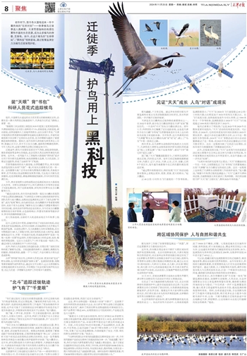 此外,科研人员还借助卫星追踪设备,实现在更广阔的空间和纬度了解候鸟迁徙。卫星追踪器的体积小、重量轻,佩戴在鸟的腿部、颈部或背部,就像一个“小书包”,不会对候鸟日常生活造成影响。