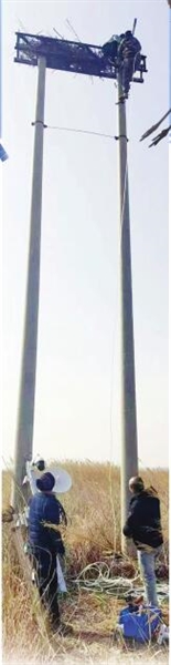 工作人员在北大港湿地安装东方白鹳巢穴的远程监控系统。