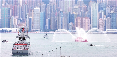 11月25日,香港特区消防船为起航返回广东湛江的海军舰艇编队行“水门礼”。 新华社发