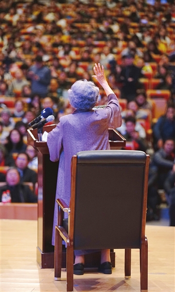 2017年,南开大学田家炳音乐厅内,时年94岁高龄的叶嘉莹先生以“心中一焰”为题进行演讲,全程两个多小时始终站立,手中宛如托举一枚火炬的瞬间被抓拍下来。