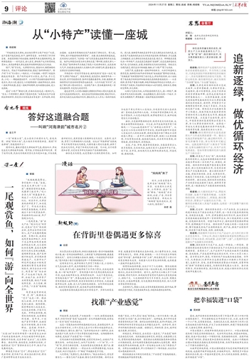 土特产里,也蕴含着一座城市的创新力。从孩子的喜好上获得灵感,杨柳青木版年画对传统的“娃娃抱鱼”图样进行改造,“熊猫抱鱼”的新图案印到了旅行包上;种业科技创新,让小站稻有了越来越多的新品种和越来越先进的配套栽培技术……从老到新,很多特产看着不起眼,却能串联起城市的过去与现在,以一件件特产为载体,河海津韵不断被注入时代特色、创新活力,跨越时空界限,历久弥新。