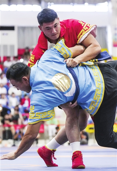 天津队选手阿拉腾松布尔(上)与天津队选手乌力吉陶格陶在北嘎87公斤级半决赛中角逐。新华社发