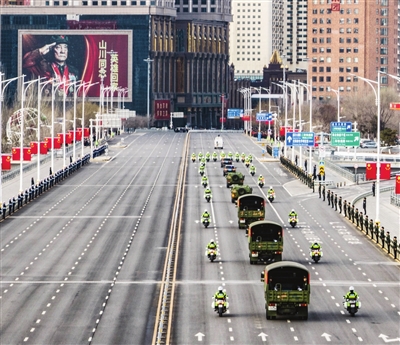 运送志愿军烈士遗骸的车队经过沈阳青年大街(无人机照片)。