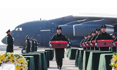 在沈阳桃仙国际机场,礼兵将殓放志愿军烈士遗骸的棺椁从专机上护送至棺椁摆放区。 新华社发