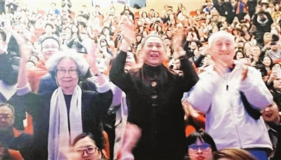 2017年3月,叶嘉莹、白先勇(中)和宁宗一在南开大学的一场活动中起立鼓掌(图片由宁宗一提供)