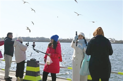 入冬以来,滨海新区塘沽老码头景区云集大批红嘴鸥,吸引游人观赏互动。 本报记者 齐向颖 摄